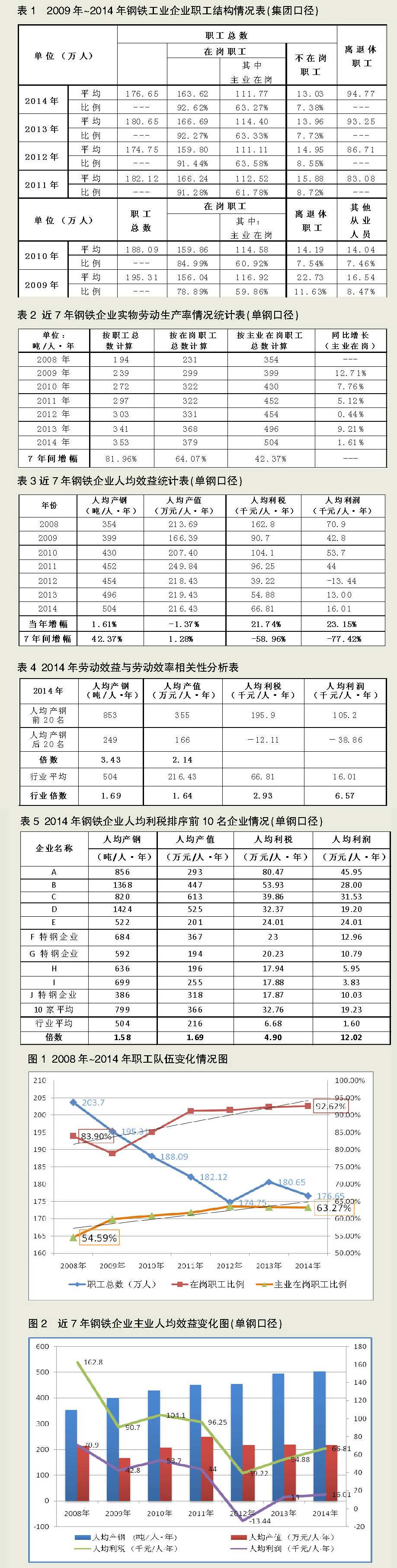 圖1顯示,2008年~2014年,納入統(tǒng)計(jì)范圍的鋼鐵企業(yè)粗鋼產(chǎn)量從3.9億噸提高到5.63億噸,增加了44%。與此同時(shí),這些企業(yè)的職工總數(shù)從204萬人降低到177萬人,降低了13%。在崗職工比例逐年提高,7年提高了8.72個(gè)百分點(diǎn),而不在崗職工比例逐年下降,主業(yè)在崗職工比例穩(wěn)步提高,7年提高了8.68個(gè)百分點(diǎn)。在行業(yè)形勢(shì)日趨嚴(yán)峻的情況下,企業(yè)通過自然減員、主動(dòng)優(yōu)化等方式,“二線職工”“三線職工”等冗余人員的比例穩(wěn)步下降。